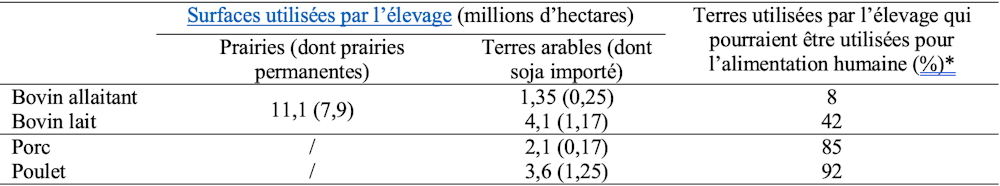 Les prairies permanentes, qu’il convient de préserver pour leur intérêt environnemental, et les co-produits agricoles, tels que les pulpes de betteraves, n’entrent pas en concurrence avec notre alimentation. Les ruminants (bovins et ovins) utilisent cependant presque autant de terres arables que les monogastriques (porcs et volailles) : céréales (blé, maïs) et oléoprotéagineux (tourteaux de soja, colza et tournesol), soit près de 50 % de la surface agricole utile, sans compter les prairies temporaires et surtout le soja importé !