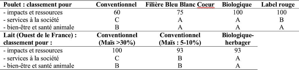 La comparaison de 4 filières de production de poulets révèle ainsi que les effets sont plus faibles pour le mode de production conventionnel en comparaison de la filière Bleu Blanc Cœur, mais aussi des labels rouge et bio ! La prise en compte de la fourniture de services et du bien-être animal inverse en revanche le classement ! La hiérarchie entre modes d’élevage est similaire pour le porc.