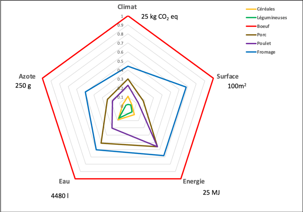 Il est clairement établi que les produits animaux ont un impact sur les ressources (énergiesurfaceeau) et sur l’environnement (émissions de gaz à effet de serre, pollutions azotées) bien supérieur à celui des produits végétaux, céréales et surtout légumineuses.